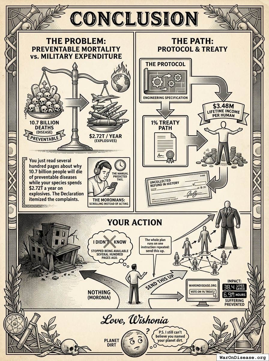 You just read several hundred pages about why 10.7 billion people will die of preventable diseases while your species spends $2.72 trillion a year on explosives. The Declaration itemized the complaints. The Protocol provided the engineering specification. The treaty path adds $3.48 million (95% CI: $1.05 million-$9.82 million) in lifetime income per human. You have now been informed of the largest uncollected refund in history.