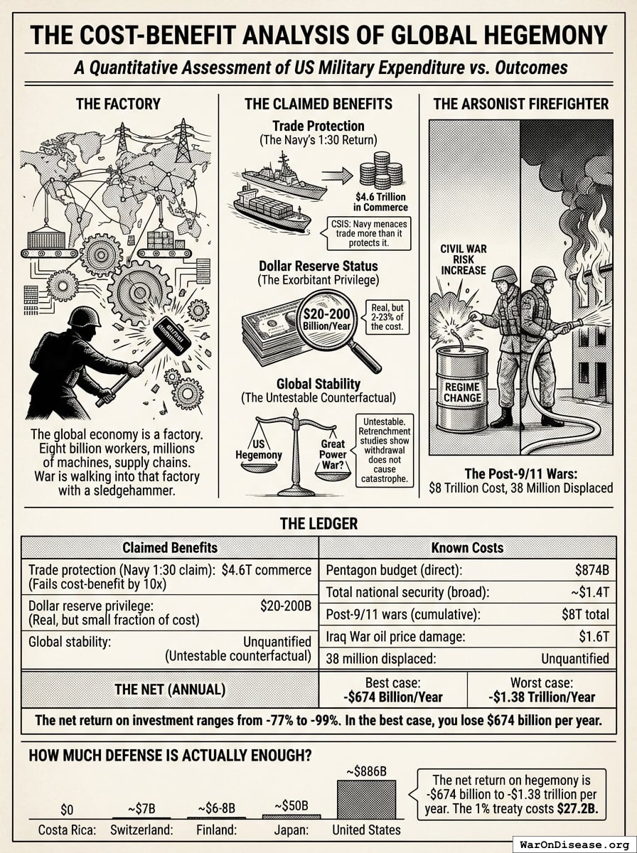 The remaining claimed benefit is “stability.” This is not quantified. It cannot be quantified because it rests on a counterfactual: “Without US hegemony, there would be great power war, nuclear proliferation, and trade collapse.”