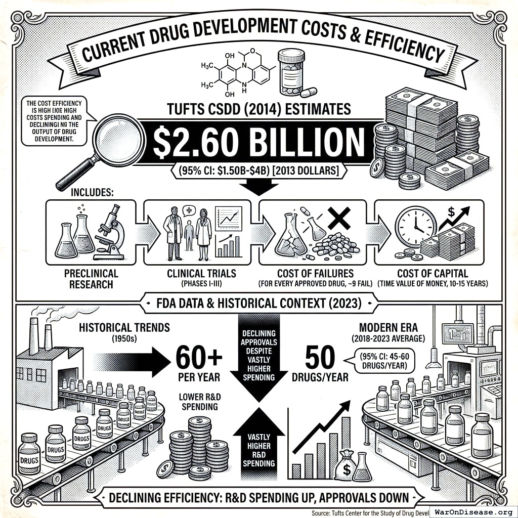 1962: Average cost $1.2 million (in 1962 dollars) 1972: $11.5 million 1977: Projected $40 million Inflation-adjusted to 2024 dollars: $1.2M (1962) ≈ $12M (2024), using CPI multiplier of 10× Real cost increase (inflation-adjusted): $12M (1962) → $2,600M (2024) = 217× increase Note: Lower estimate than Baily (1972); may reflect incomplete cost accounting or different drug types. Baily’s $6.5M (1980 dollars) = $22.5M (2024 dollars) is the more rigorous academic estimate Additional sources: https://www.congress.gov/95/crecb/1977/04/21/GPO-CRECB-1977-pt10-2-3.pdf