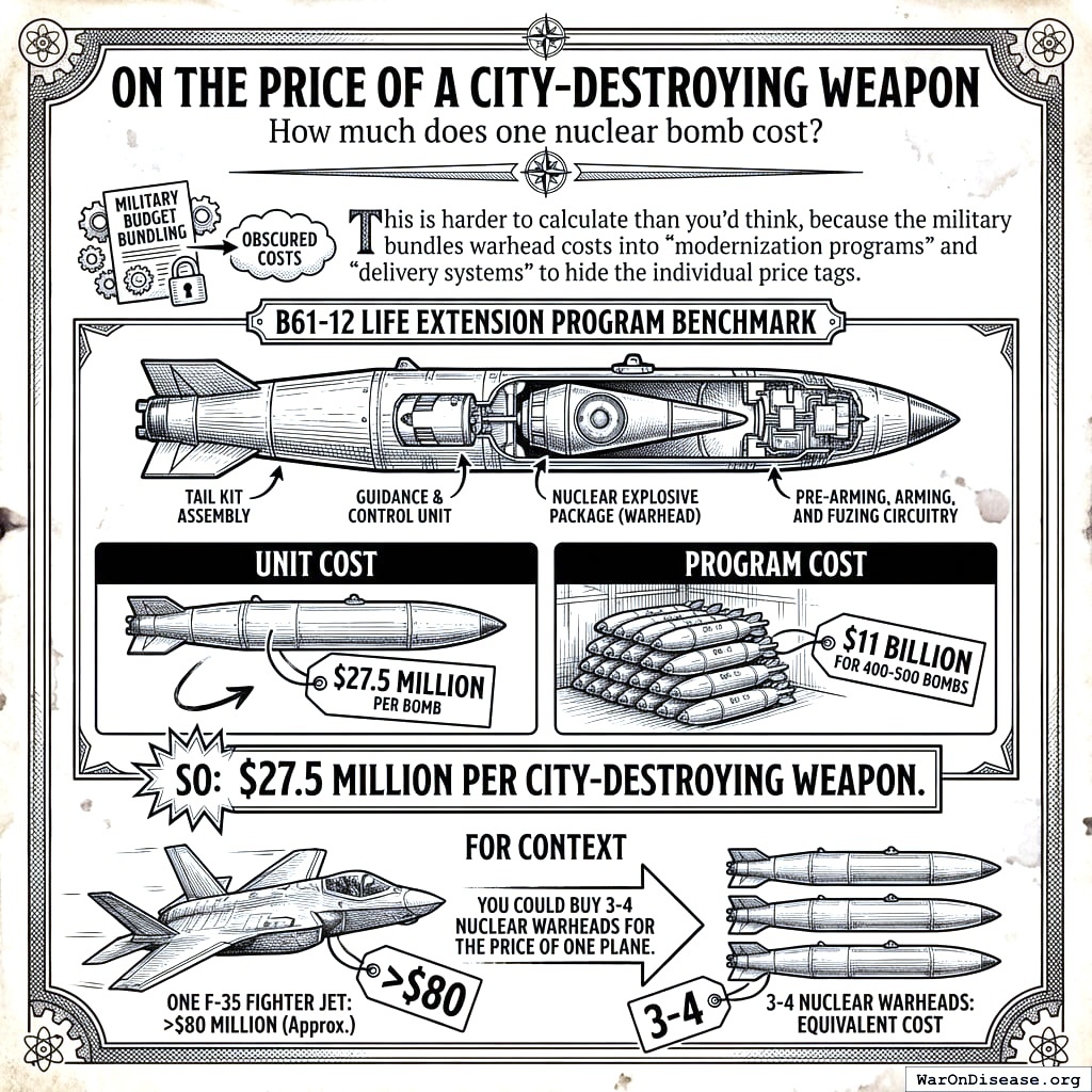 $27.5 million per city-destroying weapon. That is less than one F-35 fighter jet. You could buy 3-4 nuclear warheads for the price of one airplane. The airplane requires maintenance. The warheads just sit there, patiently, being worth more than your neighborhood.