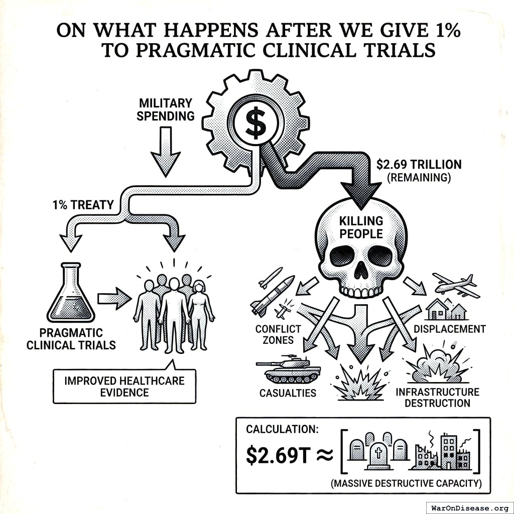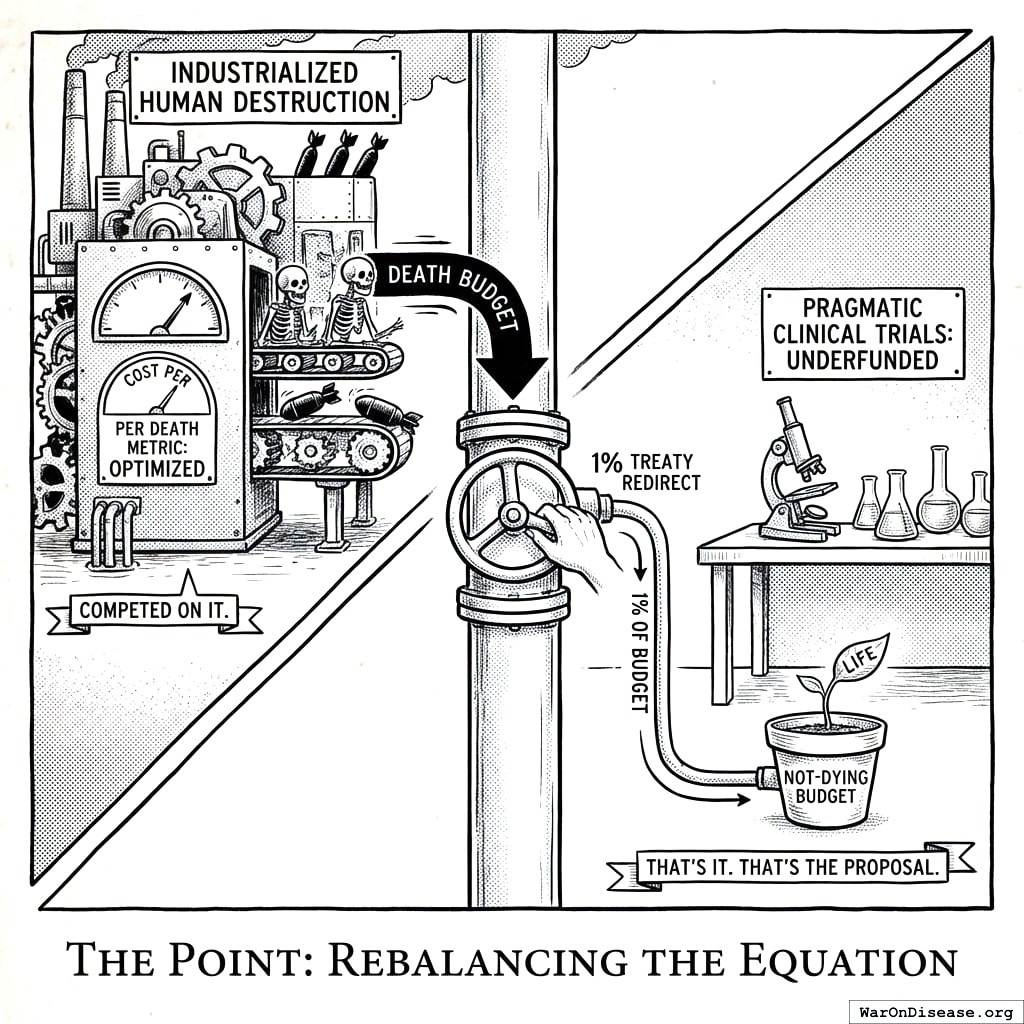A 1% treaty148 asks for $27.2 billion from this surplus. It does not touch deterrence. It does not touch nuclear arsenals. It does not touch conventional readiness. It takes from the budget that sits on top of an extinction guarantee and redirects it to clinical trials.