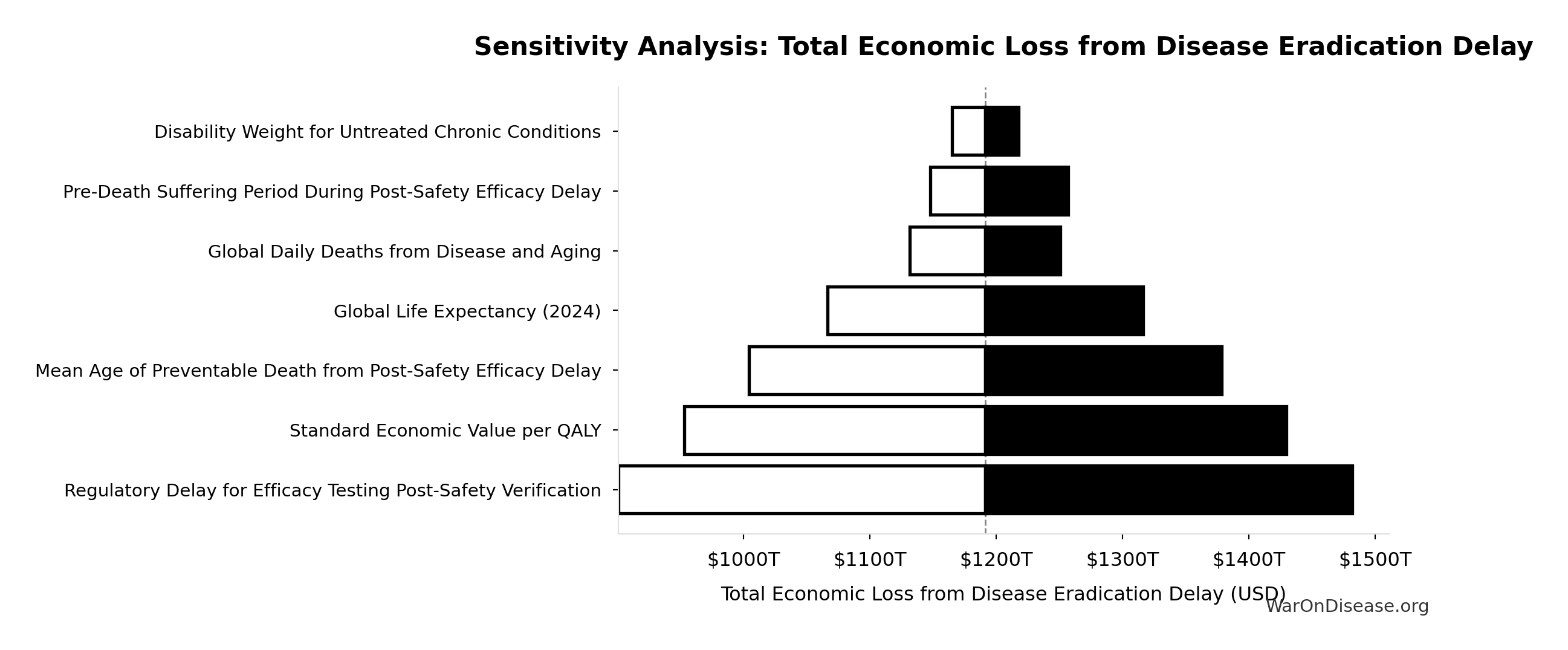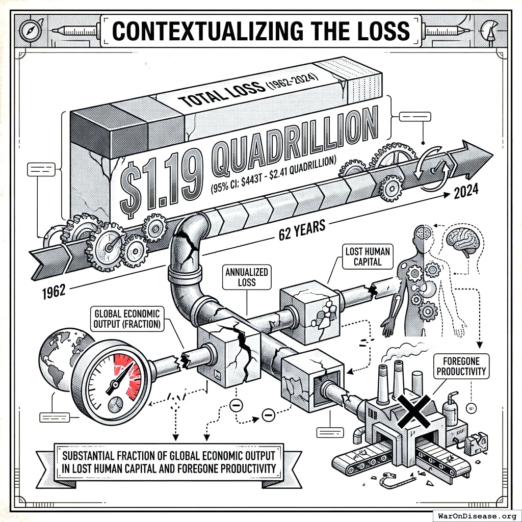 Valuing these lost years at a conservative global Value of a Statistical Life Year (VSLY) of $150,000 (95% CI: $100,000-$199,282)/DALY (the standard normative valuation used in WHO and health economics cost-effectiveness analyses), we find a cumulative economic deadweight loss of approximately $1.19 quadrillion (95% CI: $443 trillion-$2.41 quadrillion) (2024 USD). The study concludes that the societal cost of Type II Regulatory Errors (delayed access to effective therapies) exceeds the averted cost of Type I Regulatory Errors (market access for ineffective therapies) by a factor of 3,068 (95% CI: 2,878-3,125).