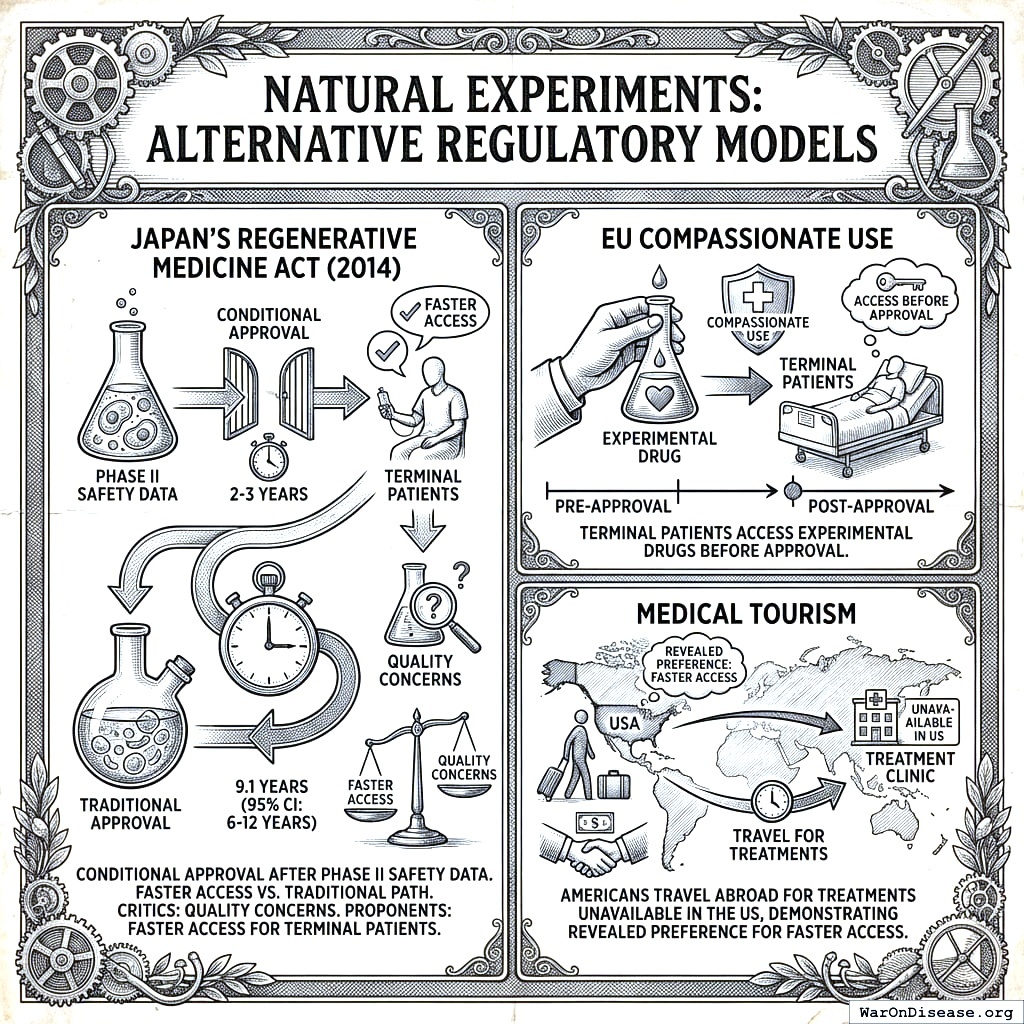 Gieringer148 synthesized these estimates, calculating 21,000-120,000 lives lost per decade from FDA delay. His work documented specific drug delays: propranolol (approved in the US 3 years after Europe for cardiac use, 10 years later for hypertension), interleukin-2 (7-year gap), and numerous other therapeutics.