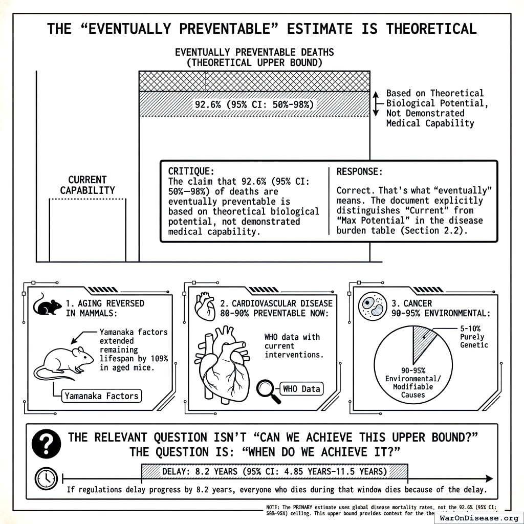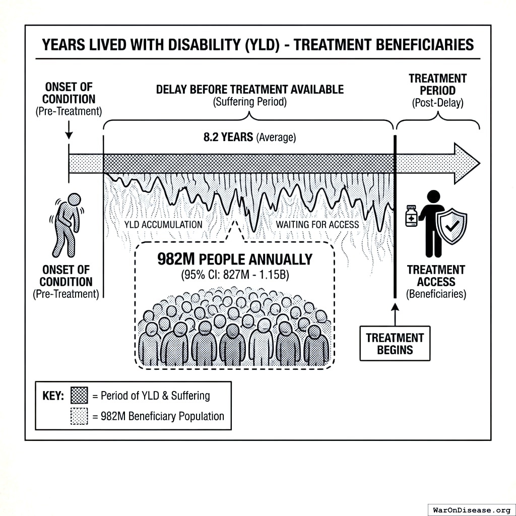 Historical mortality (1962-2024): Approximately 102 million people died waiting for approved drugs during their 8.2 years (95% CI: 4.85 years-11.5 years) approval delays. This is a lower bound - it excludes drugs never developed due to cost barriers.
