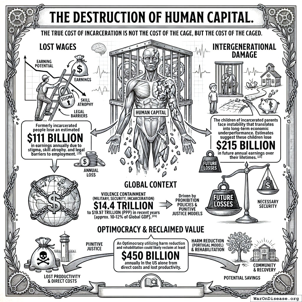 The global cost of containing violence (including military, internal security, and incarceration) was estimated at $14.4 trillion to $19.97 trillion (PPP) in recent years, or roughly 10-12% of Global GDP172. While some security is necessary, the “excess” spending driven by prohibition policies and punitive justice models represents trillions in potential savings. An Optimocracy that utilized harm reduction (the Portugal model) and rehabilitation could likely reclaim at least $450 billion annually in the US alone from direct costs and lost productivity.