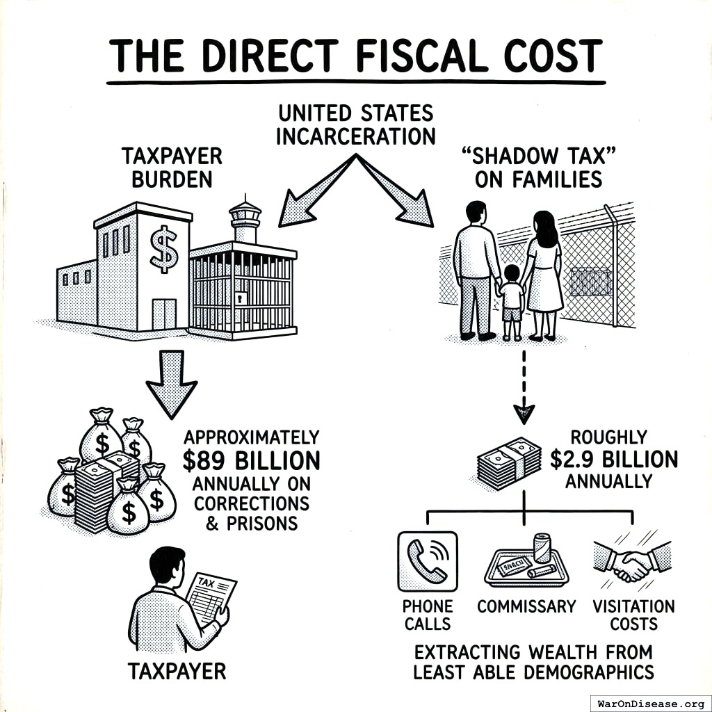 The United States, with one of the highest incarceration rates in the world, spends approximately $89 billion annually on corrections and prisons170. Beyond the taxpayer, families of the incarcerated pay a “Shadow Tax” of roughly $2.9 billion annually for phone calls, commissary, and visitation costs171, extracting wealth from the demographics least able to afford it.