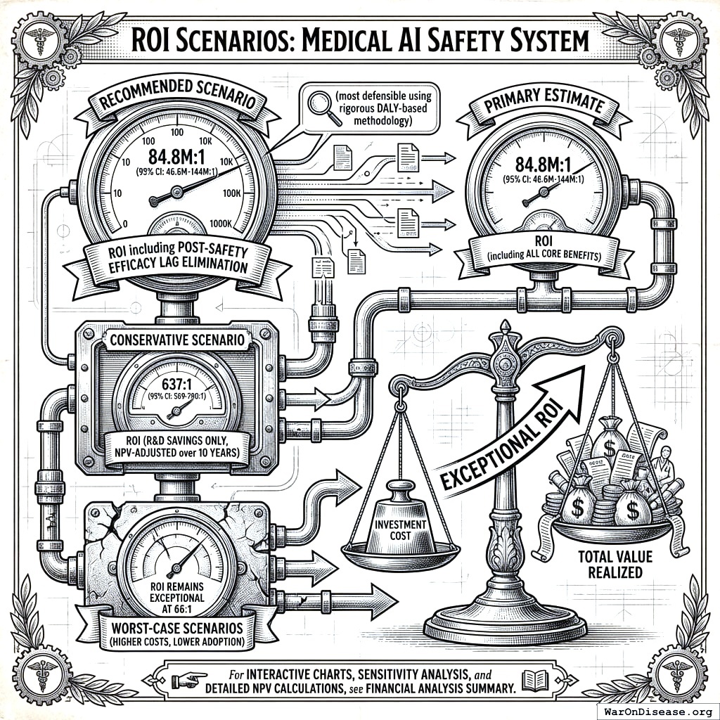 The total campaign investment: $1 billion. Even the worst case (everything goes wrong, adoption is terrible, the servers catch fire) still returns an estimated 66:1. Your worst medical outcome is better than your best military one.