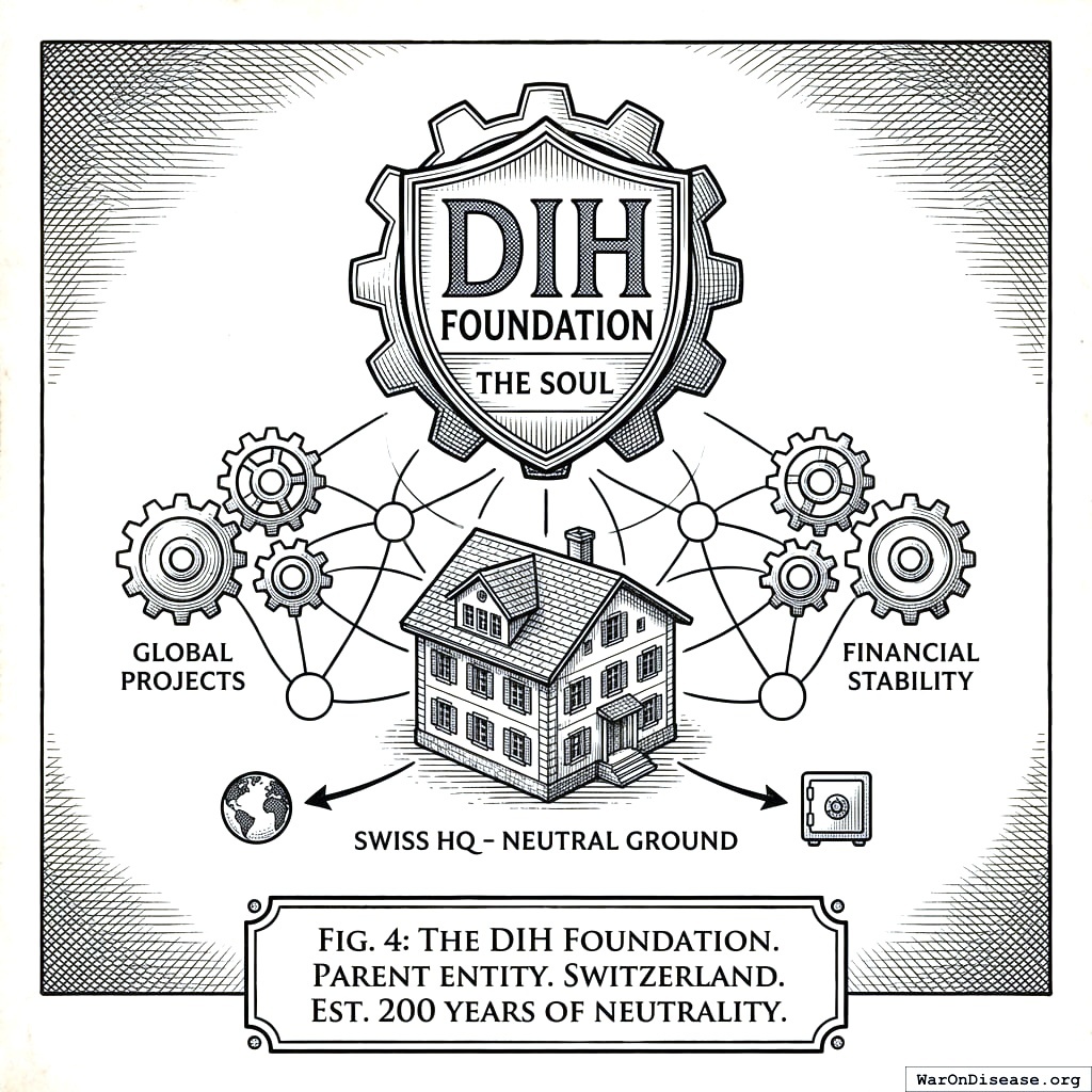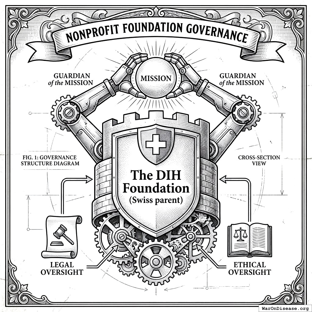 The Foundation owns 100% of Victory Corporation, ensuring profit serves mission instead of the other way around (which is what happens when you don’t do this, as demonstrated by every hospital chain, insurance company, and pharmaceutical firm that started with noble intentions and ended up maximizing shareholder value, which is corporate for “forgetting why you exist”). It accepts international grants. Its legal charter is permanently locked to ending war and disease, which means no future board can wake up one morning and decide the real mission was luxury condos all along. And it sits in a neutral jurisdiction for treaty coordination, because coordinating an international treaty from a country that is party to the treaty is like refereeing a football game in which you’re also the quarterback.