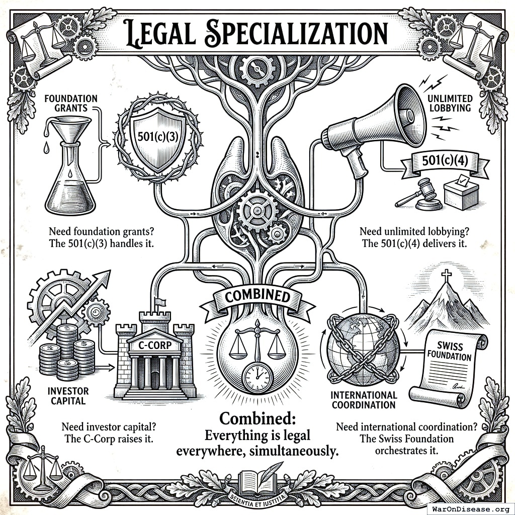 What kind of organization fits: A purpose-built 501(c)(4) social welfare organization paired with a for-profit Victory Corporation, modeled on the ACLU, NRA, or Planned Parenthood structure. These organizations have been running the same legal playbook for decades. The only difference is the target: diseases instead of guns, reproductive rights, or civil liberties.