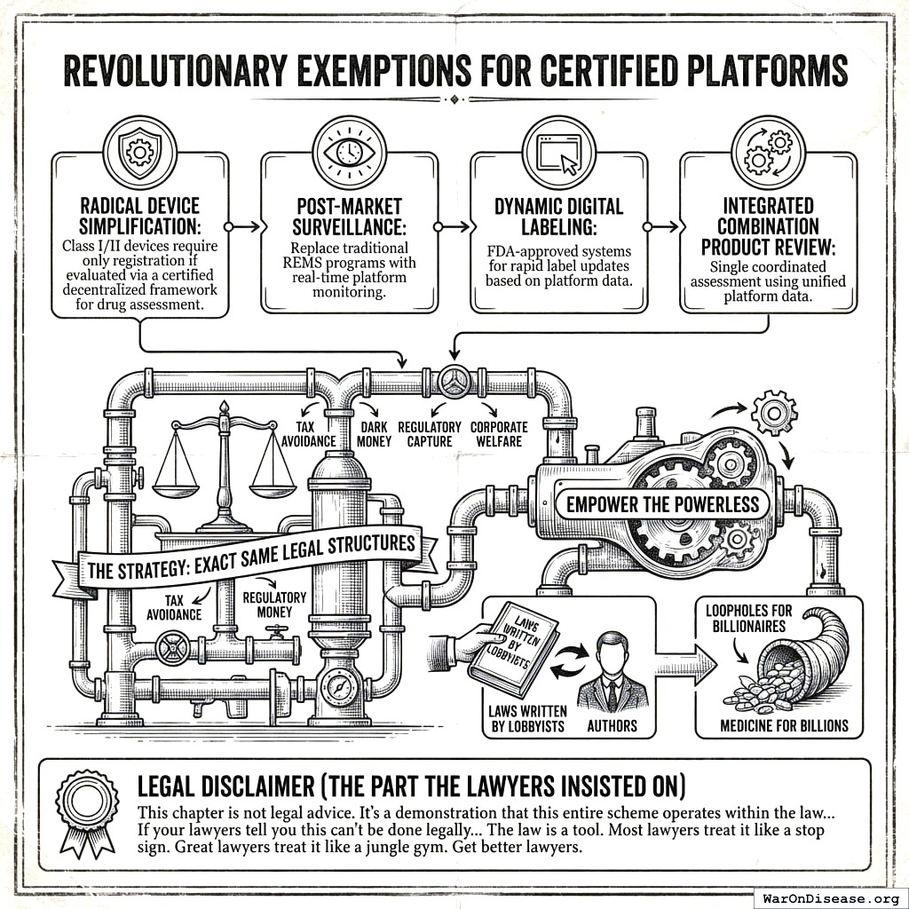 What follows is the legal architecture for curing disease using your own ridiculous laws, which is to say, using your laws exactly as written, just not as intended. On your planet, that’s the most legal thing there is.