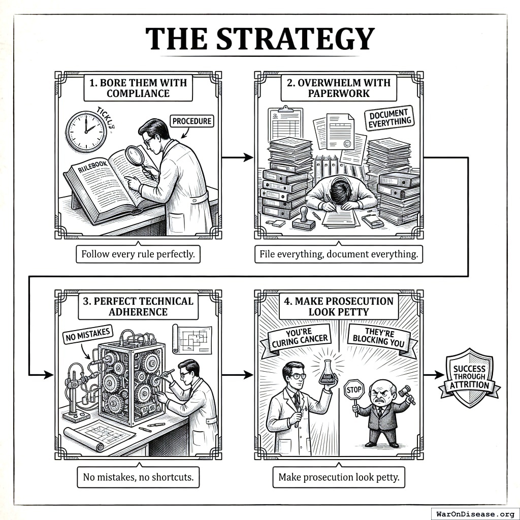 Follow every rule so perfectly that nobody martyrs the boring. Boring is your best defense. Your species has a long history of persecuting the interesting and ignoring the tedious. Be tedious. Be so tedious that the prosecutors fall asleep before they find anything, and when they wake up, the treaty has already passed, and the diseases are already being cured, and the money is already flowing, and by the time anyone objects, objecting would mean taking medicine away from sick people, which is the one thing your politicians cannot do on camera.