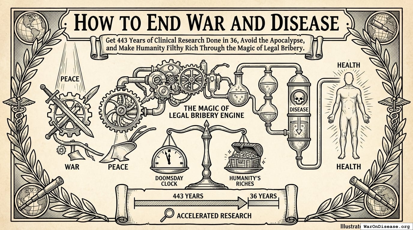 10.5281/zenodo.18161560 6.65 thousand diseases have zero FDA-approved treatments; at current trial capacity, exploring them takes 443 years. Redirecting 1% of military spending scales capacity 12.3x, cutting the timeline to 36 years and preventing 10.7 billion deaths. At $0.00177/DALY, 50.3kx more cost-effective than the best existing interventions. Incentive Alignment Bonds make adoption politically viable.
