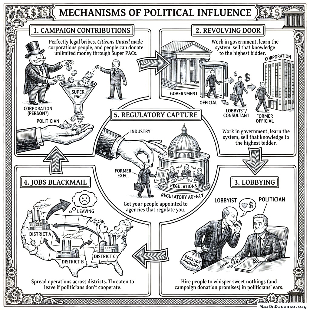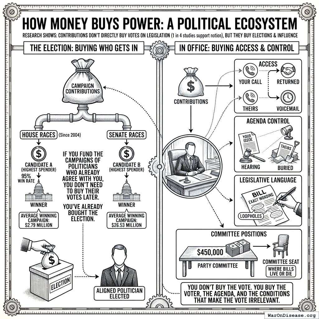 The 18-to-1 return means your disease funding is allocated by lobbying power, not by who’s dying. Diseases with celebrity spokespeople and well-funded advocacy groups get research budgets. Diseases that kill quietly, in populations too poor or too young to organize, get nothing. If your disease can’t hire a lobbying firm, it isn’t a real disease. It’s just dying, which doesn’t have a PAC.