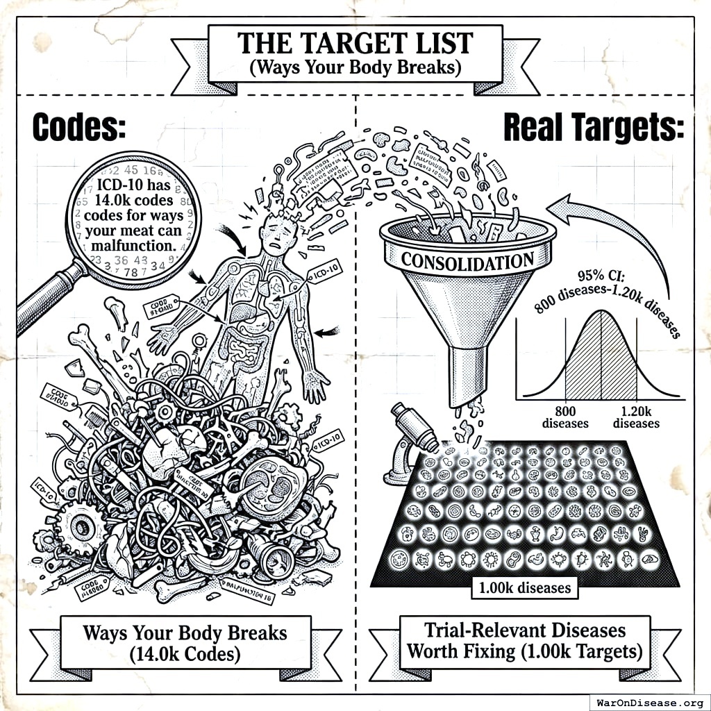- Real Targets: After consolidation, 1,000 diseases (95% CI: 800 diseases-1,200 diseases) trial-relevant diseases actually worth testing drugs against.
