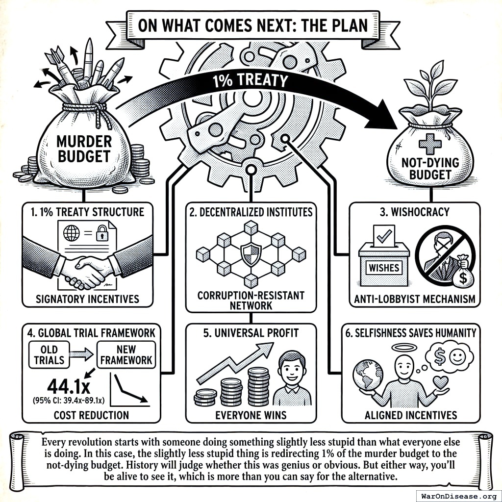 10.5281/zenodo.18161560 6.65 thousand diseases have zero FDA-approved treatments; at current trial capacity, exploring them takes 443 years. Redirecting 1% of military spending scales capacity 12.3x, cutting the timeline to 36 years and preventing 10.7 billion deaths. At $0.00177/DALY, 50.3kx more cost-effective than the best existing interventions. Incentive Alignment Bonds make adoption politically viable.