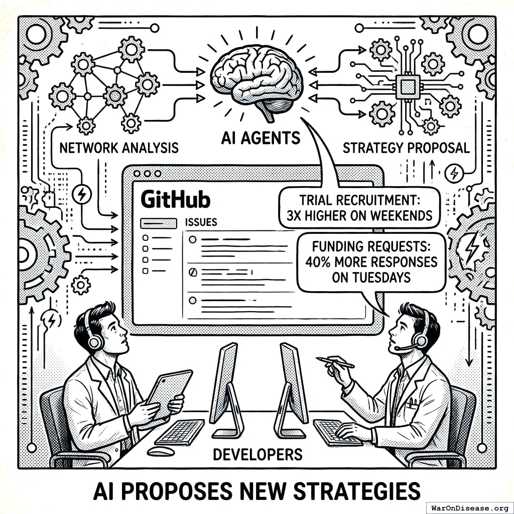 Your agents analyze what’s working across the network. They propose new strategies (via GitHub issues, because developers already live there). Example: “Trial recruitment is 3x higher when you contact researchers on weekends.” Or: “Funding requests sent on Tuesday get 40% more responses than those sent on Friday.”