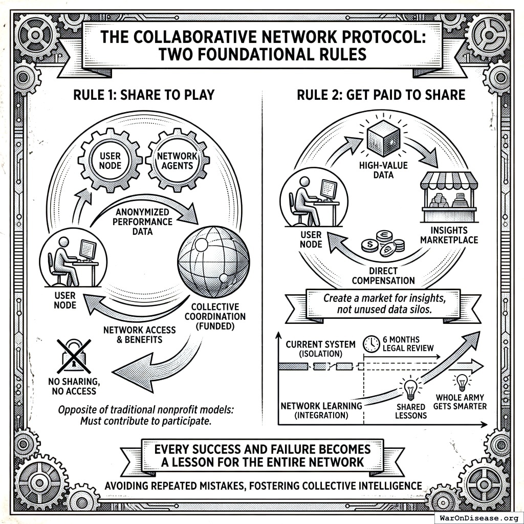 You want access to the powerful shared coordination agents (funded by the collective)? You agree to share your anonymized performance data back to the network. No sharing, no access to the network effects. This is the opposite of most nonprofit collaborations. Everyone wants the benefits but no one wants to contribute anything.