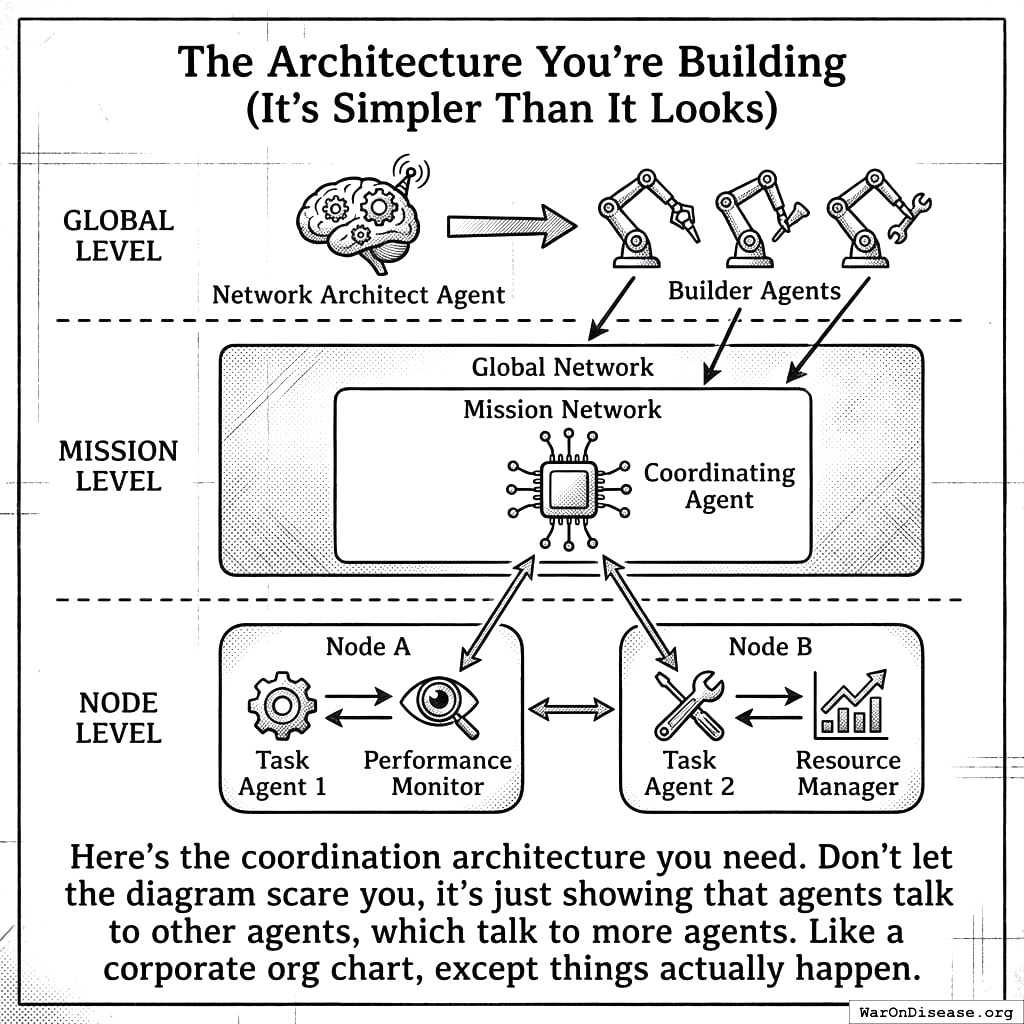 You’ve got mission control, a network of Decentralized Institutes of Health (DIH), and a targeting system (Wishocracy146). Now you need an army of AI agents to do the work. Humans are sleeping, arguing on Twitter, or attending conferences that accomplish nothing.