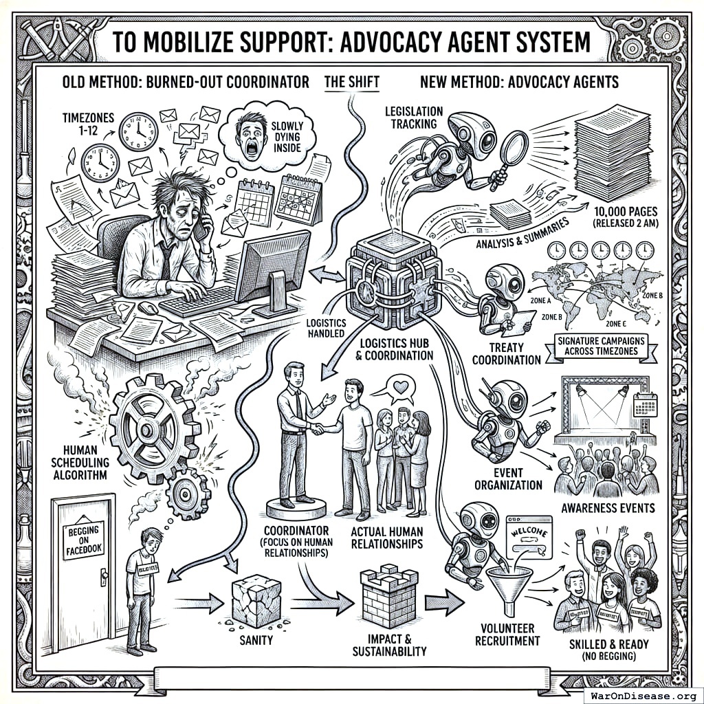 You launch advocacy agents. They track health legislation (all 10,000 pages that get released at 2 AM). They coordinate treaty signature campaigns across timezones. They organize awareness events. They recruit volunteers without the usual process of begging people on Facebook and hoping they show up.