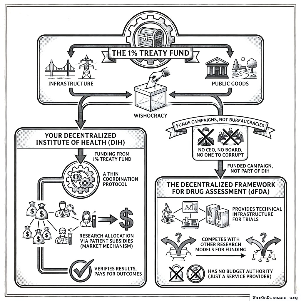 Your Decentralized Institutes of Health is not a research institution, a trial platform, or a funding agency. It’s the thin layer that coordinates all of them. The 1% Treaty Fund receives the money. Patient subsidies allocate research funding (sick people choose trials, money follows). Wishocracy allocates infrastructure through democratic voting. Trial infrastructure provides clinical trial services through competing providers. Incentive Alignment Bonds149 align investors and politicians with outcomes through legal bribery.