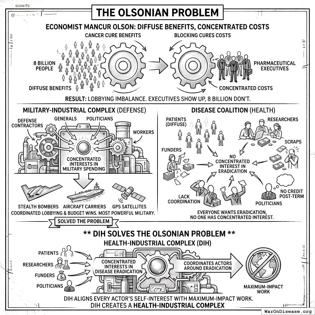 Your Decentralized Institutes of Health will solve the Olsonian problem by creating concentrated interests in disease eradication. It will build a health-industrial complex that coordinates actors around eradication the way your military-industrial complex coordinates actors around making humans stop being alive. Same structure, opposite purpose. Same selfishness, better direction.