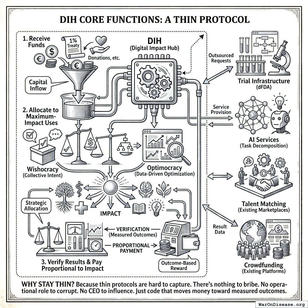 Your Decentralized Institutes of Health makes capture economically irrational by removing everything worth capturing. No CEO to bribe. Rules encoded in auditable systems (you can’t bribe an algorithm; several of your corporations have tried; the algorithm didn’t notice). Every dollar tracked on a public ledger, so corruption is visible to everyone with an internet connection. Anyone can build a competing alternative, so capturing one just triggers the creation of another. Billions vote via Wishocracy, so lobbying doesn’t scale. You can bribe a committee of twelve. You cannot bribe a billion, because the bribe would cost more than the contract you’re trying to win (and even your species can do that arithmetic). Funding is determined by outcomes, so gaming the system is harder than just performing well, which is the first time in your history that a funding system has had that property.