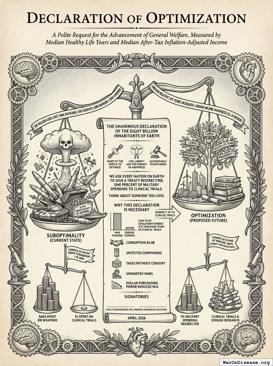 war-on-disease, 1-percent-treaty, medical-research, public-health, peace-dividend, decentralized-trials, dfda, dih, victory-bonds, health-economics, cost-benefit-analysis, clinical-trials, drug-development, regulatory-reform, military-spending, peace-economics, decentralized-governance, wishocracy, blockchain-governance, impact-investing