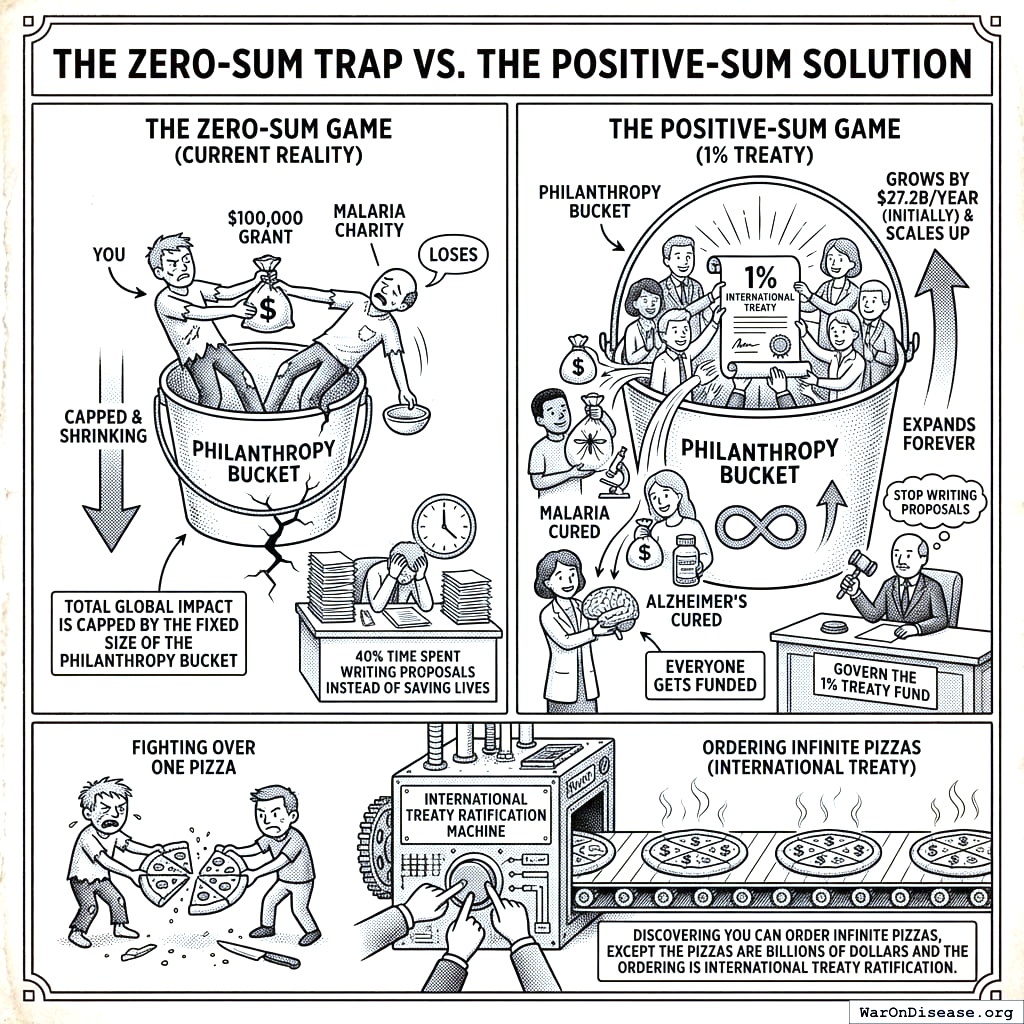 A 1% Treaty turns this into a positive-sum game. $27.2 billion per year in new funding. Malaria gets cured AND Alzheimer’s gets cured. You stop writing proposals and start getting paid for results. This is like discovering that instead of fighting over one pizza, you can just order more pizzas than anyone can eat. Except the pizzas are billions of dollars and the ordering is international treaty ratification, which admittedly takes longer than calling Domino’s.